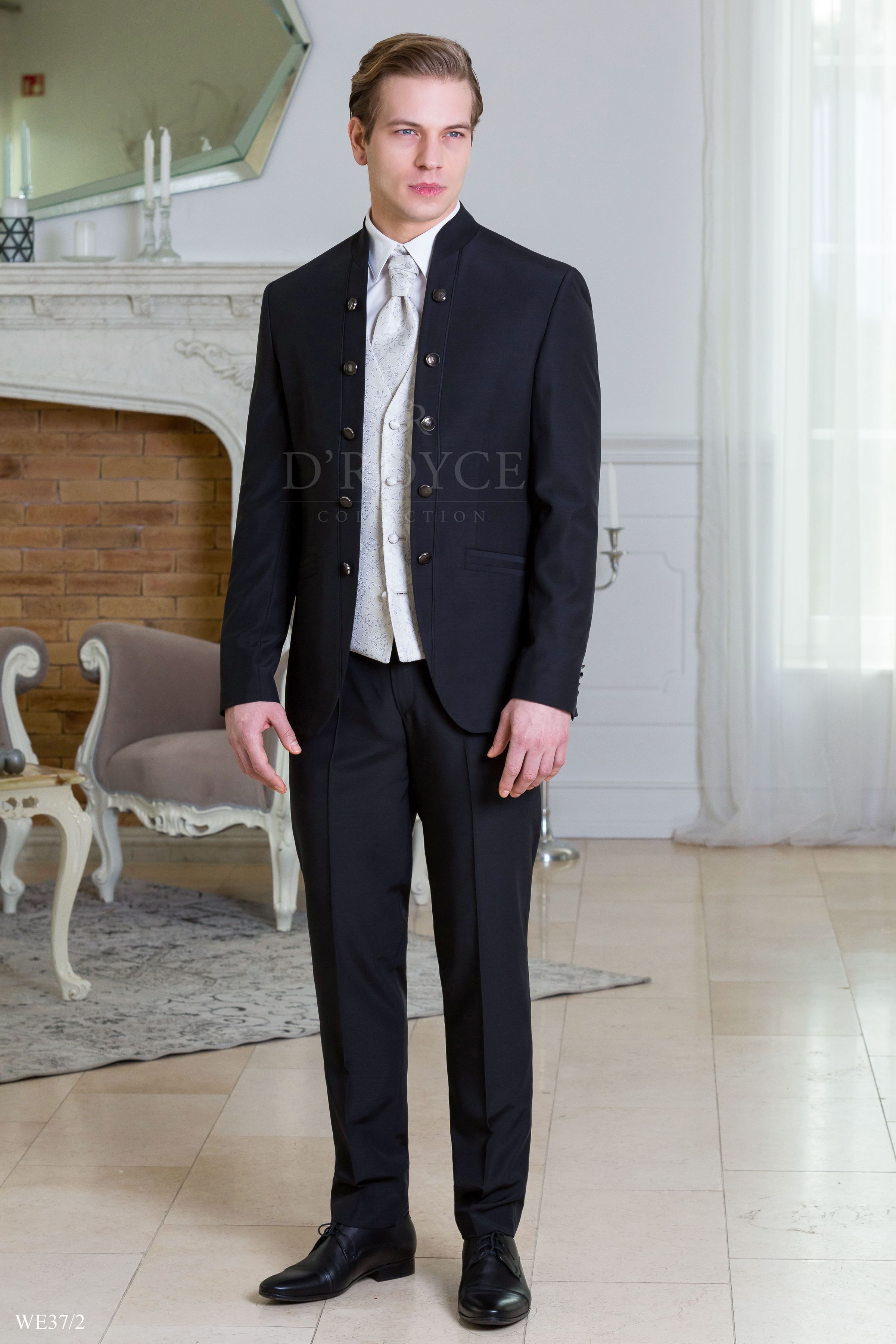 Fekete állógalléros öltöny díszgombolással