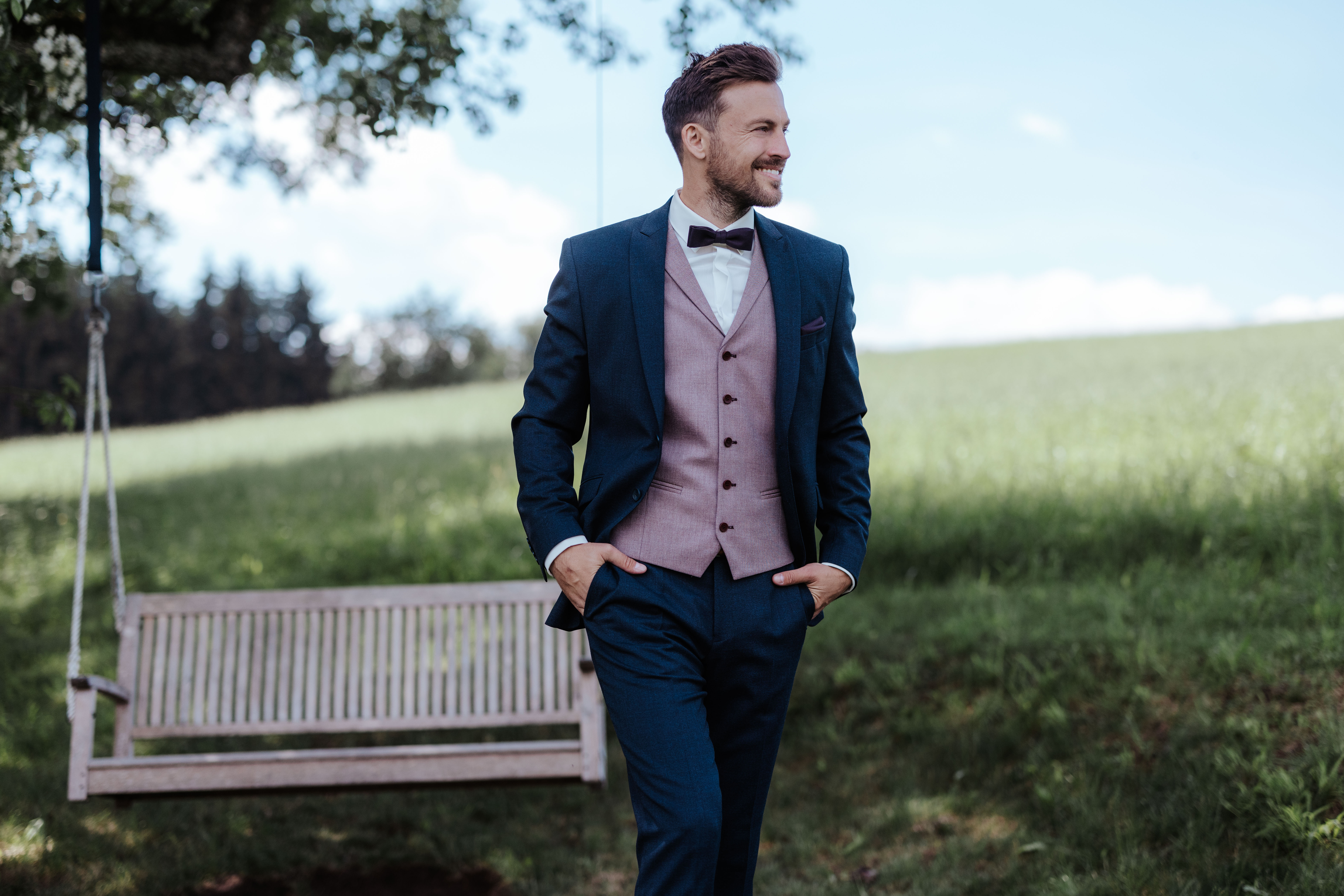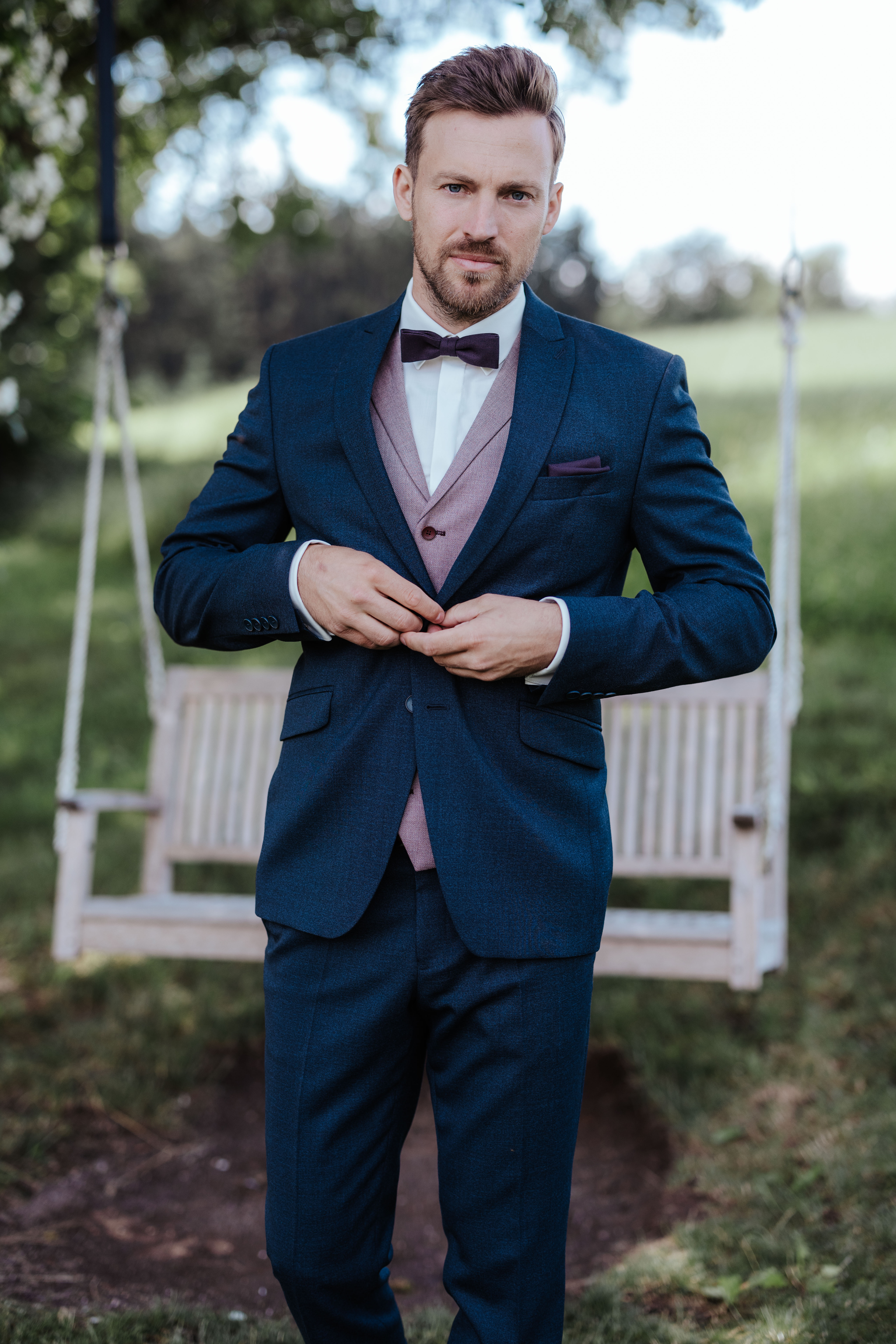 Kék öltöny bordó mellénnyel