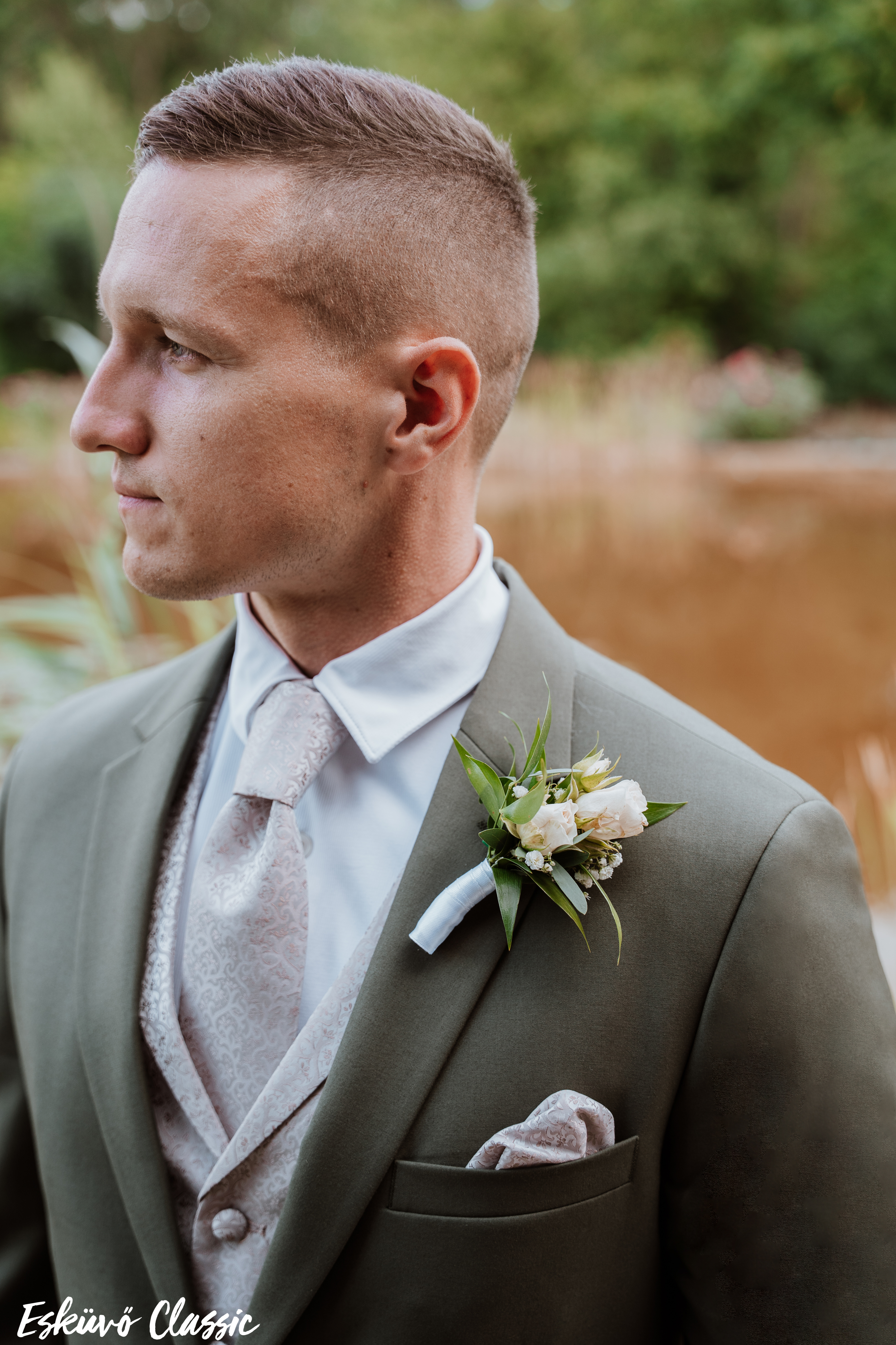 Olívazöld öltöny rézszínű apró mintás mellénnyel