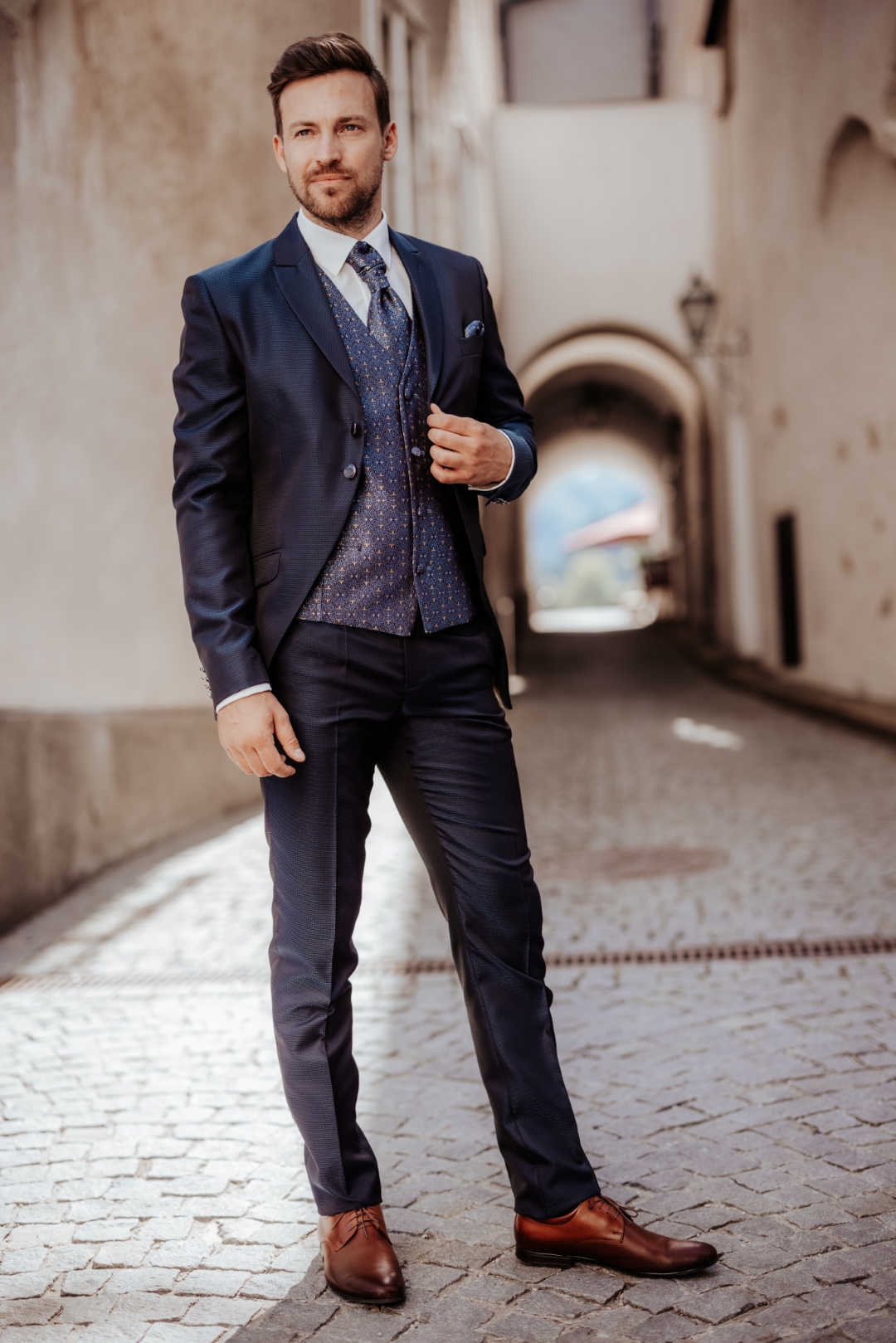 Sötét kék öltöny díszes szatén mellénnyel